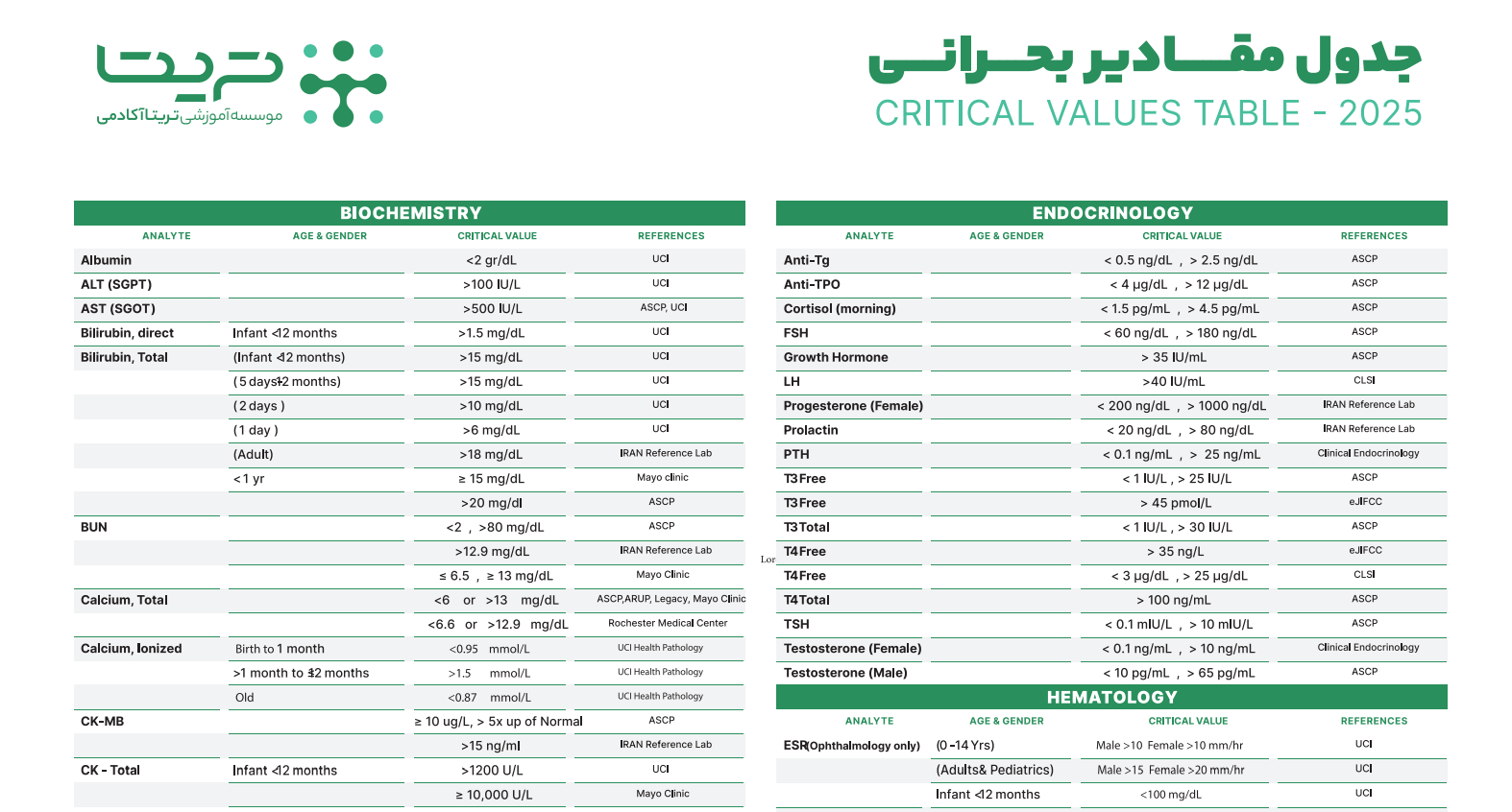 جدول مقادیر بحرانی باید پس از بررسیهای علمی و بالینی و با تأیید پزشکان مرکز یا مجموعه درمانی نهایی شود.