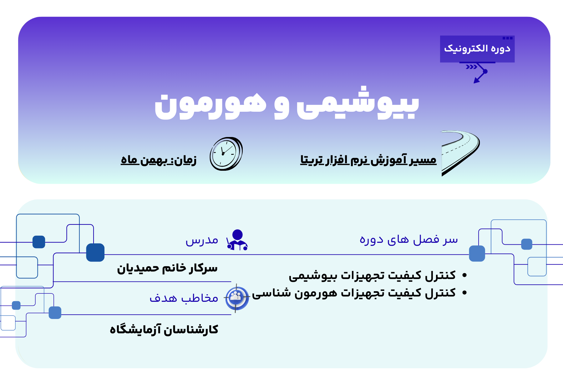 این دوره مخصوص افرادی است که در بخش آزمایشگاههای تشخیص طبی فعالیت میکنند و بهدنبال تقویت و استانداردسازی کنترل کیفیت در حوزه بیوشیمی و هورمون شناسی هستند: